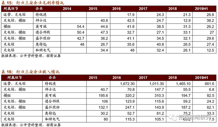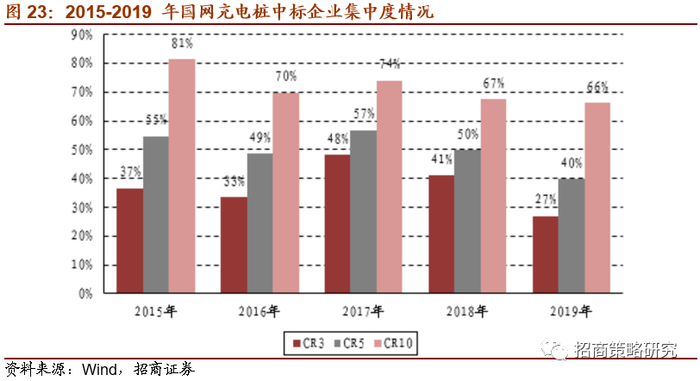 充电模组与充电桩都处于微利状态,红海竞争中可能逐步形成差异化充电桩市场高度分散,模组市场稍好一些。从2015-2019年国网中标情况看,CR3/5/10均在下滑,2019年分别为27%、40%、66%,较2018年下滑4、10、1个百分点,排名在5-10名的企业中标数量快速提升。此外,过去几年中每年中标最多最大和最小的企业份额一般约15-20%和1.5-2%,但2019年中标最多和最少的企业份额分别为9.6%和2.5%。