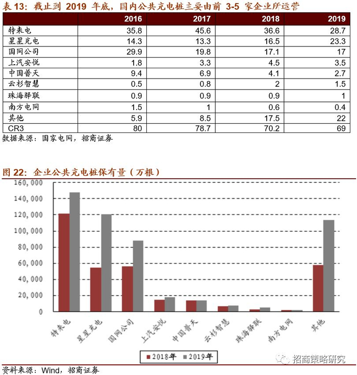 从产业链来看,目前运营市场集中度继续保持高位。中国充电联盟数据显示,截止到2019年底,国内公共充电桩主要由前3-5家企业所运营,CR3约69%,行业集中度比较高。其中特来电、星星充电、国网保有量分别达14.8、12、8.8万根。