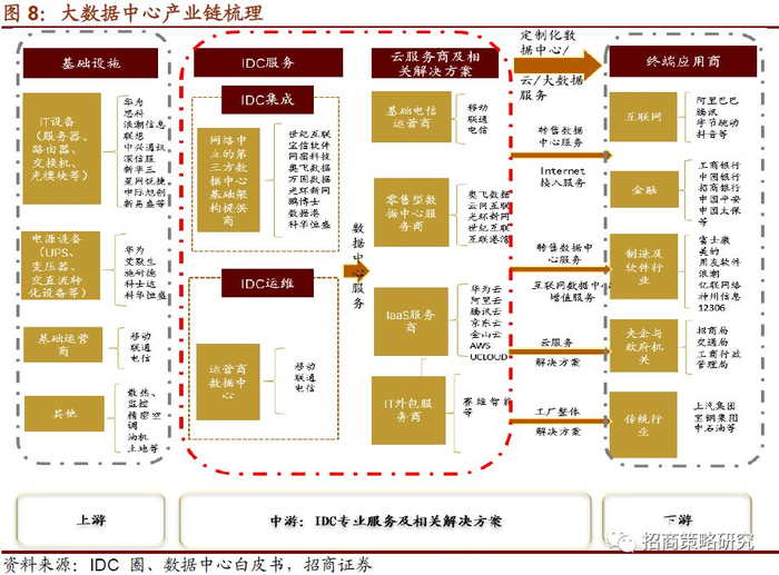 上游基础设施主要分为硬件提供商,如IT设备领域的服务器、路由器、交换机、光模块等,电源设备和运营商等;