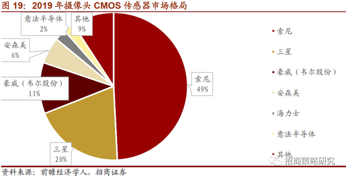 根据前瞻经济学数据显示2019年全球CMOS图象传感市场索尼占据49.2%的市场份额,遥遥领先于其他厂商,其次三星占比19.8%,豪威(韦尔股份)占比11.2%,安森美占比5.8%,海力士占比2.5%,意法半导体占比2.3%。