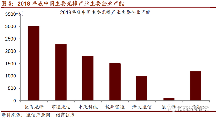 我国光纤光缆核心厂商主要有亨通光电、长飞光纤、中天科技、烽火通信、通鼎互联等企业。根据通信产业网数据显示:2018年底中国主要光棒产业主要企业产能最高的是长飞光纤,产能为3000吨,其次亨通光电产能2300吨,中天科技产能1800吨。另外产能较高的还有杭州富通、烽火通信、法尔胜,产能分别为1500吨、1000吨、100吨。
