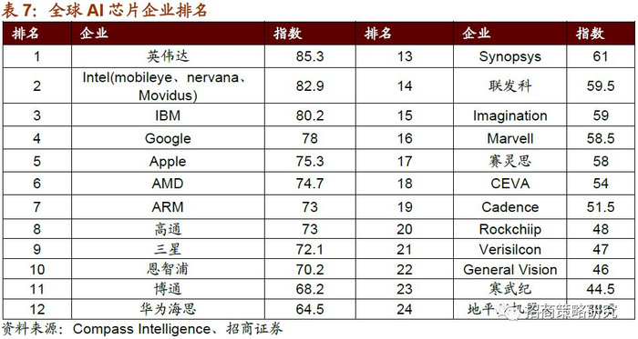 根据Compass Intelligence将全球AI芯片按照指数排名,前十得企业分别是英伟达、Intel、IBM、Google、Apple、AMD、ARM、高通、三星和恩智浦。