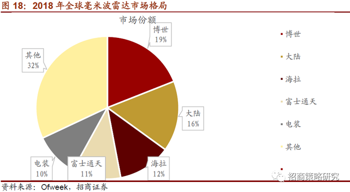 2018年全球毫米波雷达市场博世占据市场份额最大达19%,其次大陆占比16%,海陆占比12%,富士通天占比11%,电装占比10%。