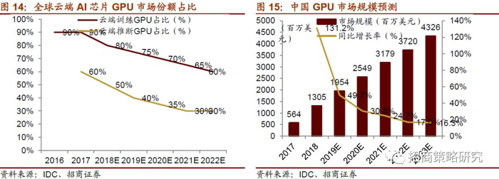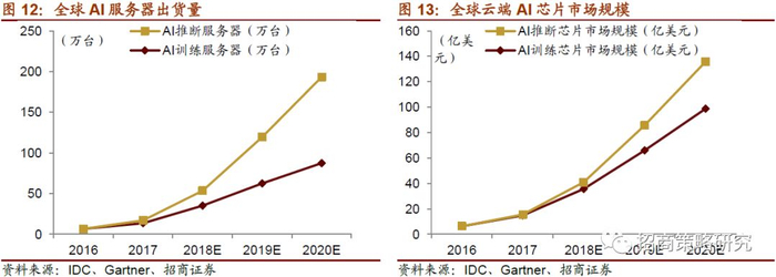 IDC数据显示,2016年全球训练AI芯片市场规模为6.3亿美元,预计2020年约为98.8亿美元;全球AI推断芯片从2016年的0规模,到2020年预计增长至37亿美元。