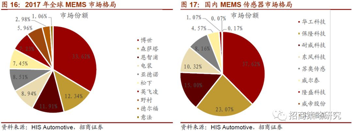 HIS Automotive数据显示,2017年全球前三大MEMS供应商博世、森萨塔、恩智浦合计占据超过50%的市场份额。仅博世的市场率达到了33.62%,其次森萨塔占据12.34%的市场,恩智浦占据11.91%的市场。此外电装占比8.94%、亚德诺占比8.51%、松下占比7.45%、英飞凌占比7.23%、野村占比5.96%、德尔福占比2.98%、意法占比1.06%。