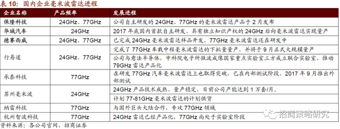 国内企业积极研发毫米波雷达。2017年底国内首款自主研发、具有独立知识产权的24GHz后向毫米波雷达由华域汽车实现量产;德赛西威已完成24GHz毫米波雷达样品开发,77GHz毫米波雷达还在研发中;保隆科技在2月份发布公司自主研发的24GHz、77GHz的毫米波雷达产品。承泰科技、纳雷科技、杭州智波科技也取得了一定的进展。