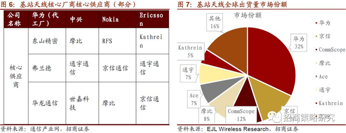 基站天线核心厂商的招标模式由4G时的运营商对基站天线单独采集,变为5G时代的将天线集成在设备商AAU中,不再单独招标。华为(代工厂)的核心供应商有东山精密、弗兰德、华龙通信;中心得核心供应商有摩比、通宇通讯、世嘉科技;Nokia的核心供应商有RFS、京信通信、摩比; Ericsson的核心供应商有Kathrein、通宇通讯、京信通信。