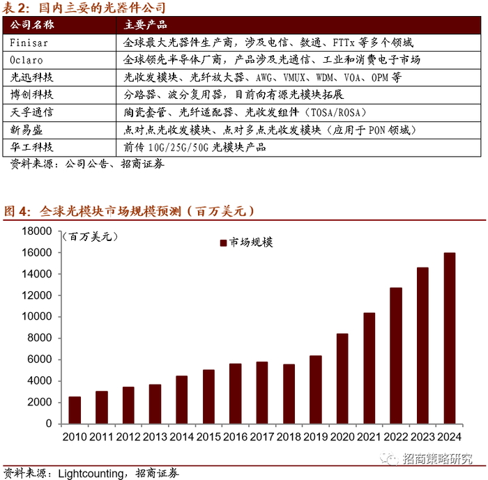 国内主要的光器件公司主要有光迅科技、天孚通信、新易盛、华工科技等。光迅科技主要产品有光收发模块、光纤放大器、AWG、VMUX、WDM、VOA、OPM等;博创科技主营分路器、波分复用器,目前正向有源光模块拓展;天孚通信主营陶瓷套管、光纤适配器、光收发组件(TOSA/ROSA);海外光器件核心厂商有Finisar,是全球最大的光器件生产商,涉及电信、数通、FTTx等多个领域,已经被已被II-VI收购;Oclaro是全球领先半导体厂商,产品涉及光通信、工业和消费电子市场被Lumentum收购,此外还有NeoPhotonics、Acacia等。