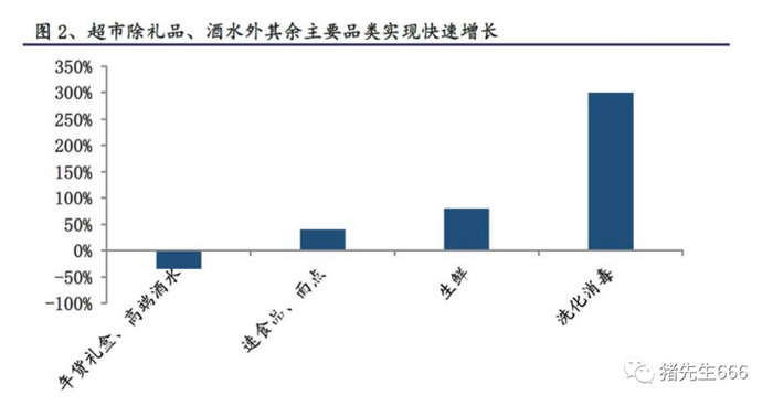 其次,必选消费销售渠道来说,超市渠道正常营业,销售额大增。