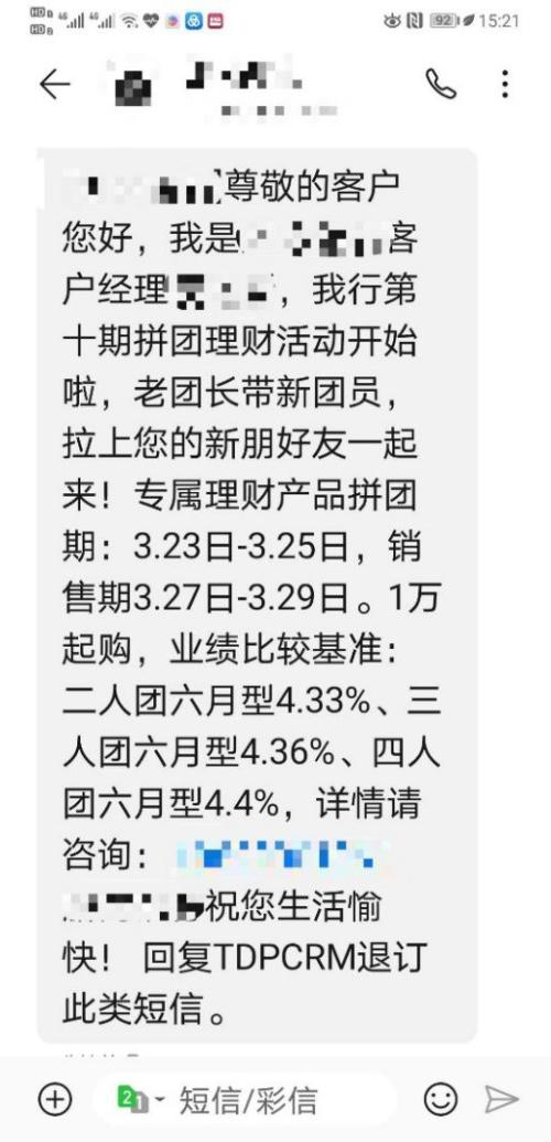 该行老客户王阿姨被这种银行理财“拼多多”模式带起了兴致。她表示:“目前银行理财产品的年化收益率在4%左右,‘拼团’之后收益一下子高了不少。”于是,在收到“拼团”理财的推销短信后,王阿姨立即让丈夫开了一张新卡,“二人团”随即拼成功。