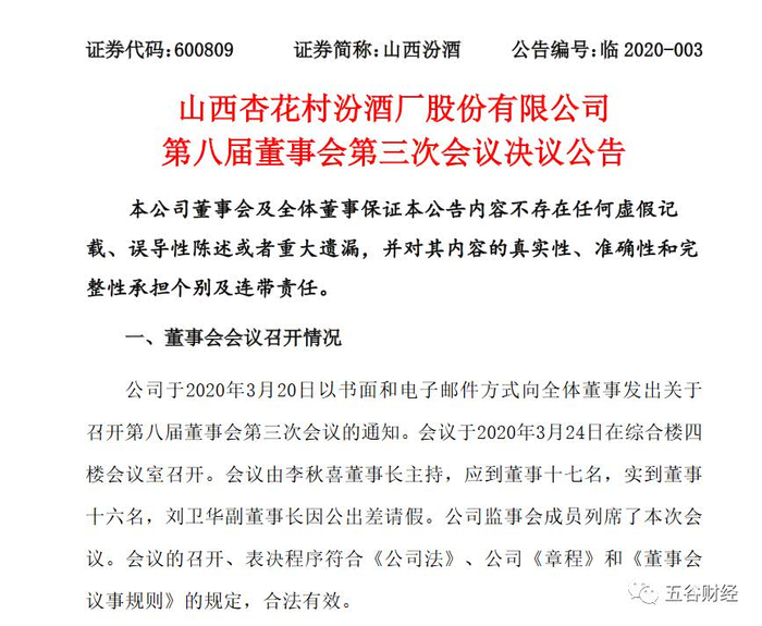 发布了《第八届董事会第三次会议决议公告》,会议由李秋喜董事长主持,应到董事十七名,实到董事十六名,刘卫华副董事长因公出差请假;山西汾酒审议通过了《关于对山西杏花村竹叶青酒营销有限责任公司增加注册资本的议案》。