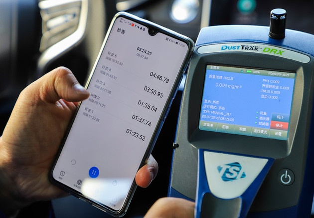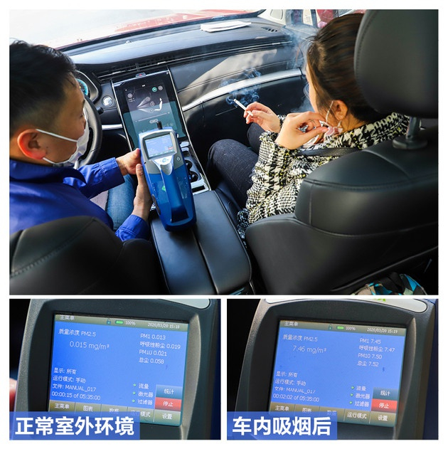 我们通过在车内吸烟的方式,对荣威RX5 MAX的空气净化器进行了实验。当天室外的PM2.5数值为0.015mg/m3,随后进入车内并关闭车窗、空调与空气净化器,在抽完一根香烟后,PM2.5数值达到了7.46mg/m3,之后再打开空调与空气净化器进行检测。