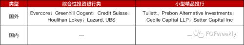 在二手份额交易市场上比较知名的精品咨询公司有Eaton Partners, Campbell Lutyens, Greenhill, Park Hill Group(PJT Partners的子公司) 等等,少数全业务的综合性国际投行也会提供类似服务(如UBS、Lazard)。但一般来说全业务国际性投行因为成本原因不会接交易额太小的案子,而精品咨询公司在这方面比较灵活,而且在细分领域经验更为丰富和专业。