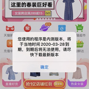 据悉,该弹窗内容显示“您使用的程序是内测版本,将于当地时间2020-03-28到期,到期后将无法使用,请尽快下载最新版本。”而如果用户按照弹窗提示进行操作,打开新下载的淘宝App弹窗仍将继续出现。