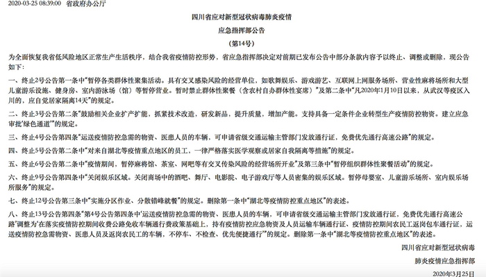 四川省疫情应急指挥部发布的“14号公告”。截图