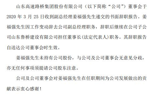 3月25日消息,近日山东路桥(000498)董事会于2020年3月25日收到副总经理姜福强递交的书面辞职报告。姜福强因工作变动辞去公司副总经理职务,辞职后继续在公司子公司山东鲁桥建设有限公司担任董事长(法定代表人)职务。其辞职报告自送达公司董事会时生效。
