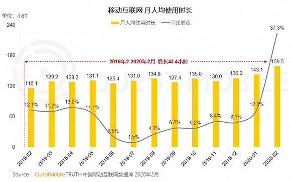 许久未见的用户时长增长,出现在了2020年1-2月;图源:Quest Mobile