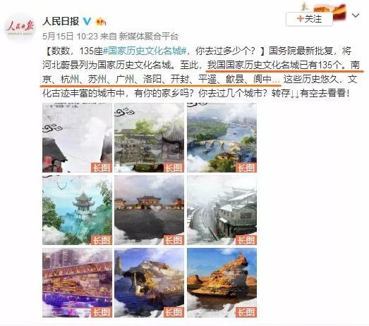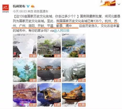 而紧接着,“杭州发布”官方微博转发:【这135座国家历史文化名城,你去过多少个?】国务院最新批复,将河北蔚县列为国家历史文化名城。至此,我国国家历史文化名城已有135个。杭州、苏州、广州、洛阳、开封、平遥、歙县、阆中…… 这些历史悠久,文化古迹丰富的城市中,有你的家乡吗?via@人民日报