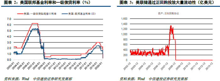 降息及公开市场操作:2007年8月开始的次贷危机在随后几个月逐步加重,为了维护金融体系的稳定和缓解信贷市场的混乱,美联储自2007年9月起连续下调联邦基金目标利率,由5.25%下调10次至2018年12月的0-0.25%。通过积极的正回购为市场注入大量流动性。