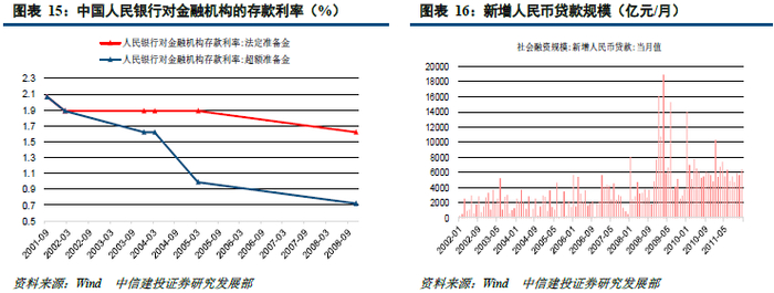 利率政策:2008年9月至12月,中国人民银行先后五次下调金融机构存贷款基准利率。其中,1年期存款基准利率由4.14%下调至2.25%,1年期贷款基准利率由7.47%下调至5.31%,此后直至2010年10月才开始上调。两次下调中国人民银行对金融机构的存贷款利率,其中法定准备金和超额准备金存款利率由1.89%和0.99%分别下调至1.62%和0.72%,此后未作调整;1年期流动性再贷款利率由4.68%下调至3.33%,再贴现利率由4.32%下调至1.80%,此后直至2010年12月才上调。