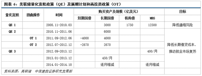 量化宽松政策(QE)及展期计划和再投资政策(扭曲操作,OT):为刺激实体经济以推动就业复苏、缓解市场通缩风险、稳定市场流动性减缓金融风险,美联储自2008年11月起先后推出3轮量化宽松货币政策,购买美国长期国债、机构债、MBS资产,其中QE3没有设具体上限和停止日期,被称为“开放式量化宽松”。3轮量化宽松政策期间美联储购买的长期国债和MBS规模超过3.9万亿美元。此外,在QE2结束后,量化宽松政策在维持金融环境稳定、摆脱通缩威胁等目标取得较好效果,但在促进经济增长、就业增长等目标上效果并不显著,同时美国通胀压力上升,美联储在刺激政策上采取了更为谨慎的展期计划和再投资政策,在购买美国长期国债的同时卖出基本等额的短期国债,期间长期国债购买额达6670亿美元。