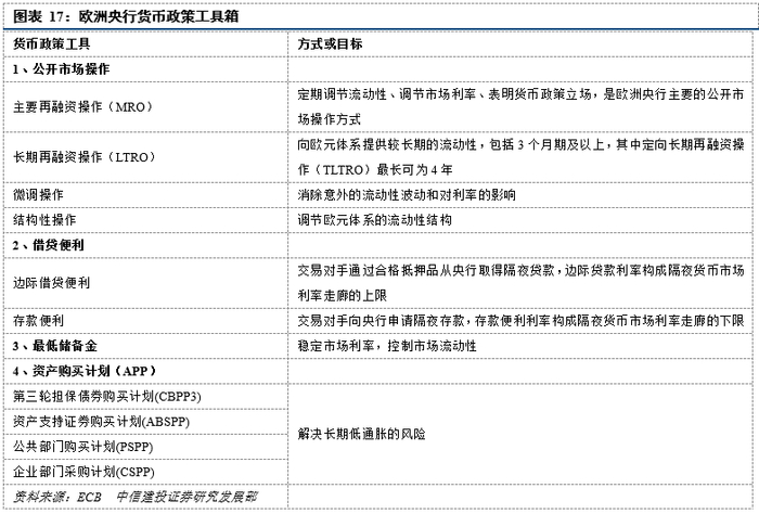 欧洲央行货币政策工具箱中包括公开市场操作、借贷便利、最低储备金、资产购买计划。公开市场操作中的主要再融资操作(MRO)是欧洲央行调节流动性和市场利率、表明货币政策立场的主要工具,也是是欧洲央行主要的公开市场操作方式,其他公开市场操作工具主要是调节结构性的、临时性的流动性失衡。借贷便利工具的运用主要是打造利率走廊的上下限。资产购买计划则是为解决长期低通胀的风险创设的非常规货币政策工具。