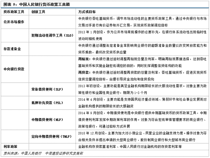 我国央行货币政策工具箱中除了西方经济学中普遍提到的公开市场操作、再贴现、存款准备金率三大工具外,还有再贷款、利率政策等具有中国国情的工具。2013年以来,央行陆续创设了应对银行体系流动性短期波动的短期流动性调节工具(SLO)、满足金融机构期限较长的大额流动性需求的常备借贷便利(SLF)、发挥中期政策利率作用的中期借贷便利(MLF)及支持特定领域的抵押补充贷款(PSL)、定向中期借贷便利(TMLF)等工具。