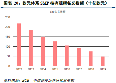 证券市场计划(SMP):2010年5月起,欧元体系央行通过从二级市场购买成员国的公共和私人部门债券,以解决证券市场功能丧失和货币传导机制受阻问题,2012年9月随直接货币交易计划(OMT)的推行而退出。截至2012年末,欧元体系央行持有的SMP价值为2180亿元。截至2020年3月13日,SMP持有量剩余410.27亿欧元。