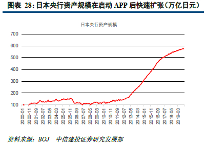 重启零利率+量化宽松货币政策:2010年10月,日本央行将隔夜拆借利率降至0-0.1%。同时宣布启动35万亿日元的资产购买计划(APP,包括购买国债、商业票据、公司债、ETF、J-RIET和资金支持操作),此后日本发生大地震与核泄漏事件,叠加欧债危机等外部影响,日本央行持续增加资产购买计划的规模。2012年12月日本央行提出到2013年底资产购买计划规模达到101万亿日元,贷款支持计划(LSP)到2014年3月达到20万亿日元以上,从此日本央行资产负债表开始快速扩张。