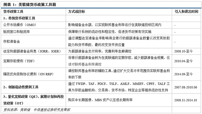 在次贷危机前,美联储的货币政策工具主要是通过公开市场操作工具来调控流动性,进而影响联邦基金利率。贴现窗口运用较少,主要是弥补市场临时流动性短缺的问题。次贷危机发生以来,美联储创设了多种支持特定市场和主体的流动性便利工具,还启动了量化宽松政策(QE)和展期计划和再投资政策(扭曲操作,OT),丰富了其货币政策工具箱。