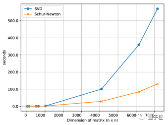 实际上,四次逆根不仅可以用SVD方法算出,也可以用舒尔-牛顿法(Schur-Newton algorithm)算出,而且随着矩阵维度的增大,后者节约的时间越来越可观。