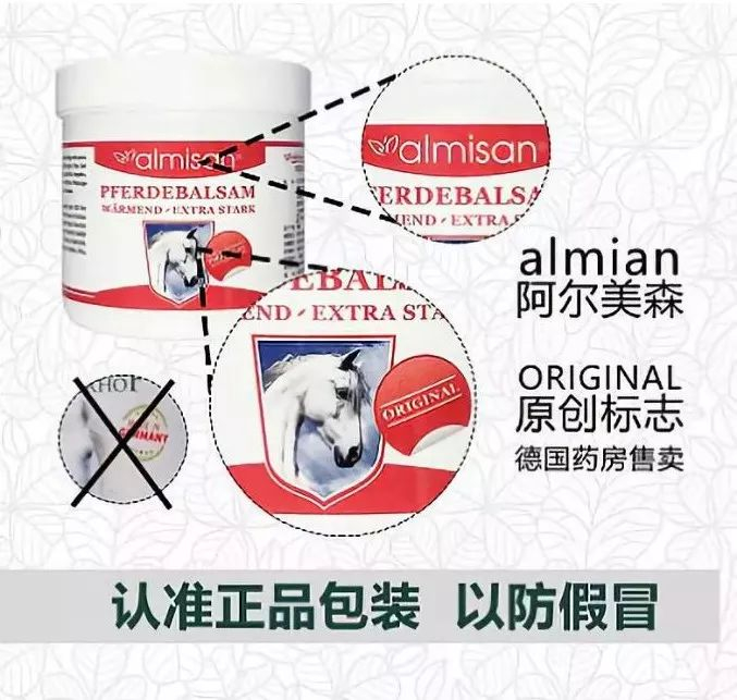 其次,认准「almisan」商标,正品商标马头向右,仿品的马头居中或向左。