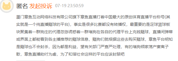 华云网注意到,2019年7月,有网友在黑猫投诉平台上反映,章鱼直播在没有转播权的情况下播放比赛,其实就是在各自的代理平台上充钱赌球,直播间弹幕或界面上都能看到各主播推荐的赌球信息,章鱼平台明知是赌球也没有封杀。