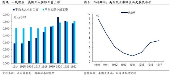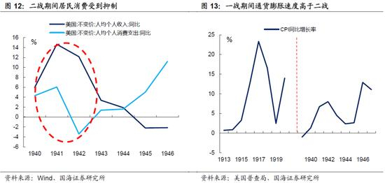 统制经济制度:两次世界大战期间,美国联邦政府均实行了一些经济管制制度,以利于战争生产,如为工厂下达生产指标、征收企业多余利润,管控重要物资价格等。但相比于一战而言,二战的经济管制制度更加严格,美国对部分食品、金属制品、橡胶等重要物资均采用了限量配给制度,极大地限制了居民消费,但同时也抑制了通货膨胀的快速上行。