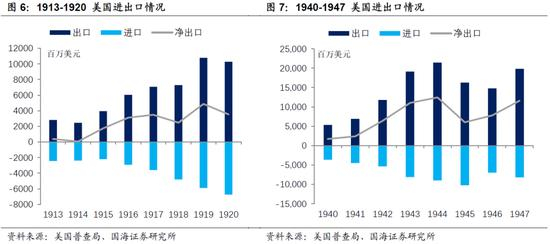 除政府开支外,两次世界大战期间美国向欧洲国家大量出口军需用品,同样促进了美国工业产出的增长。1919年与1944年,美国的净出口占当年GDP的比重分别达到了13.6%与9.6%。