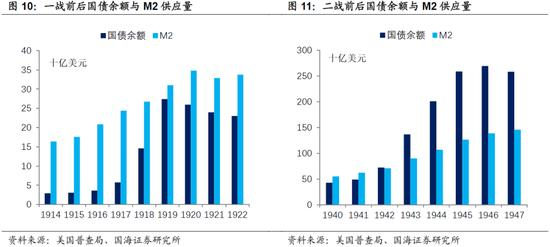 财政制度方面:战争期间政府支出需求巨大,尽管通过加税、征收企业多余利润等手段,增加了政府部分收入,但依然存在大量赤字需要依靠发债来弥补。一战前后,美国国债余额增长了8.4倍;二战前后,美国国债余额增长了4.5倍。