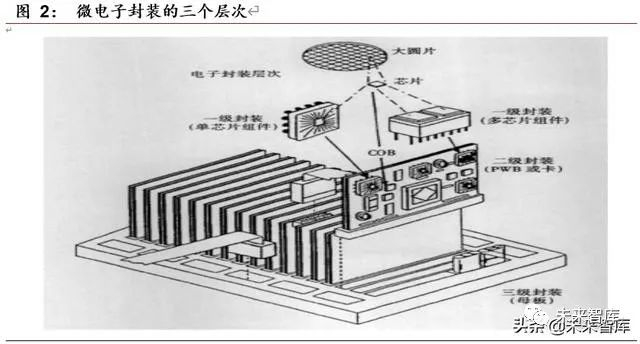 微电子封装的范围涉及从半导体芯片到整机,在这些系统中,生产电子设备包括 6 个层次,也即装配的 6 个阶段。我们从电子封装工程的角度,按习惯一般称层次 1 为零级封装;层次 2 为一级封装;层次 3 为二级封装;层次 4、5、6 为三级封装。