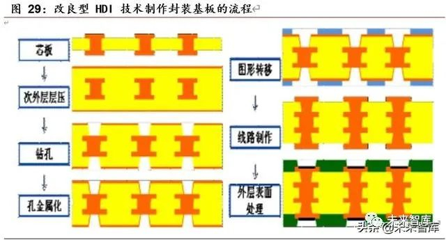 基于磁控溅射种子层的电沉积互连结构是一条全新的封装基板制造技术途径,该制作技术被称为改良型半加成法。此外,由于该技术途径不像 HDI 技术需要制作芯板,因此被称为无核封装基板制作技术。