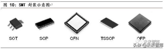 从 SOT 到 QFN,芯片封装壳支持的管脚数越来越多,芯片封装壳的管角间距越来越小。