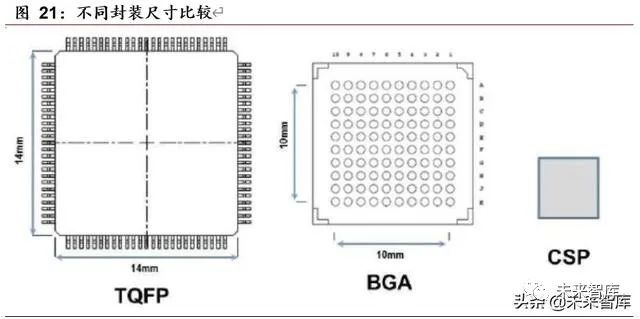 CSP 技术可以确保超大规模集成电路在高性能、高可靠性的前提下,以最低廉的成本实现封装的尺寸最接近裸芯片尺寸。与 QFP 封装相比,CSP 封装尺寸小于管脚间距为 0.5mm 的 QFP 封装的 1/10;与 BGA 封装相比,CSP 封装尺寸约为 BGA 封装的 1/3。