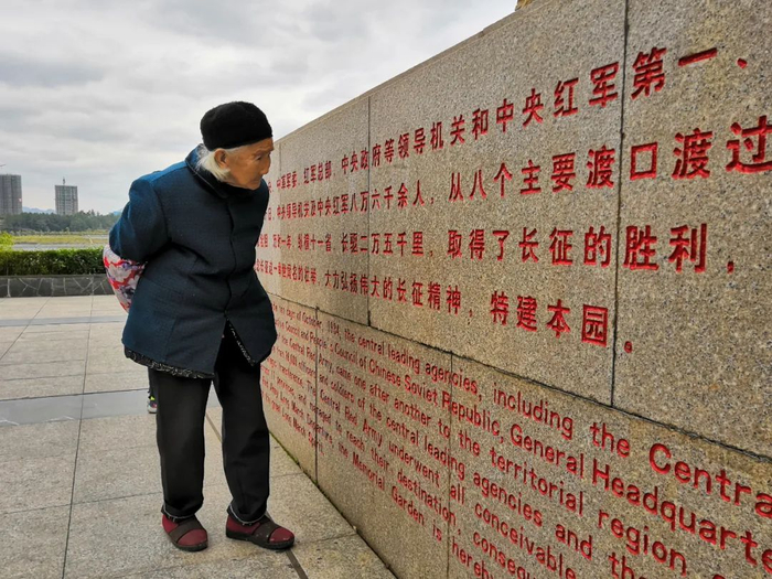 2018年,一位于都老人在读长征纪念雕塑背面的文字