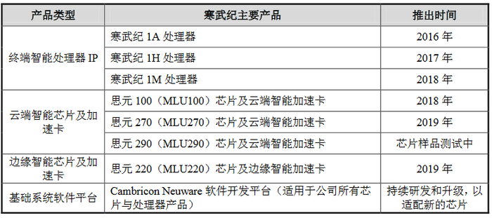 寒武纪目前主要产品为面向云、边、端三大场景分别研发了三种类型的芯片,分别为终端智能处理器IP、云端智能芯片及加速卡、边缘智能芯片及加速卡,并为上述三个产品线所有产品研发了统一的基础系统软件平台。