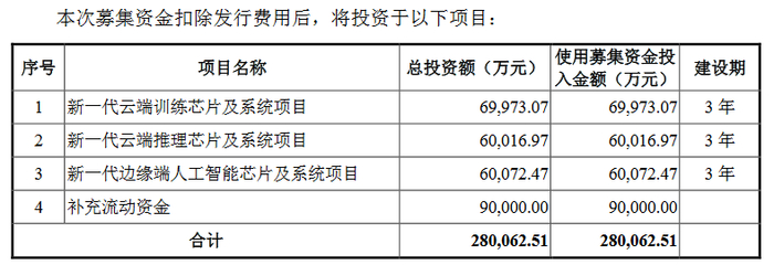 分别投资于新一代云端训练芯片及系统项目约7亿元,投资于新一代云端推理芯片及系统项目约6亿元,投资于新一代边缘端人工智能芯片及系统项目约6亿元,用于补充流动资金约9亿元。