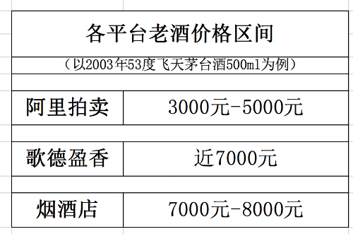 而在歌德盈香平台上,北京商报记者发现,2003年53度飞天茅台酒500ml装售价近7000元。另外,2003年52度五粮液500ml装售价仅2000元。