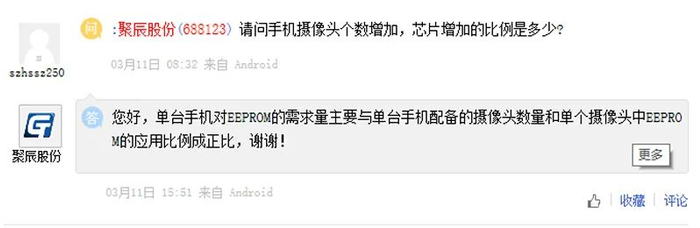 对此,聚辰股份回复:单台手机对EEPROM的需求量主要与单台手机配备的摄像头数量和单个摄像头中EEPROM的应用比例成正比。单台手机摄像头增加,将拉动公司EEPROM芯片和音圈马达驱动芯片等产品需求量提升。