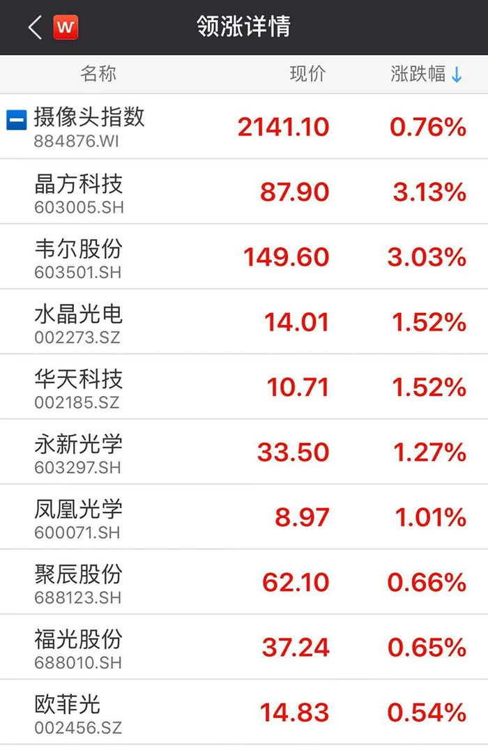 在27日上午A股交易中,摄像头概念股不同程度上涨。由Wind编制的摄像头指数午间收盘时涨幅为0.76%。晶方科技及韦尔股份上涨超3%。而华为概念指数上涨0.6%。