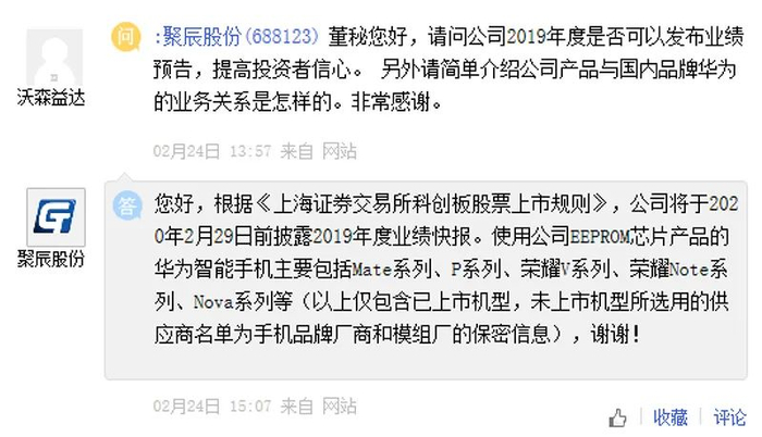 据悉,作为全球排名第三的EEPROM芯片供应商,聚辰股份的产品广泛应用于智能手机、液晶面板、蓝牙模块、通讯等领域。其中在手机领域,使用公司EEPROM芯片产品的华为智能手机主要包括Mate系列、P系列、荣耀V系列、荣耀Note系列、Nova系列等。