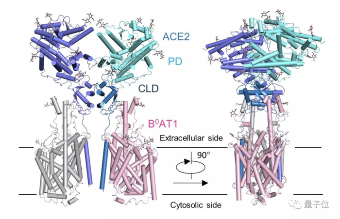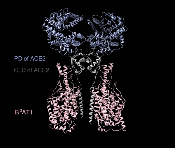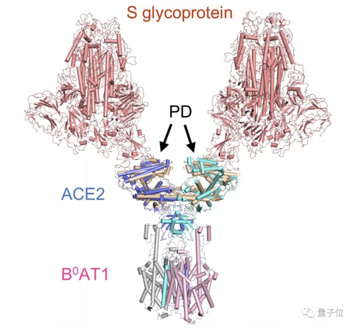 上面的蓝色和灰白色部分,是ACE2的两个结构PD(肽酶结构域,peptidase domains)和CLD(Collectrin样域,Collectrin-like domain),但ACE2很难在体外稳定获得,常常是与肠道内的一个氨基酸转运蛋白B0AT1打包一同出现。