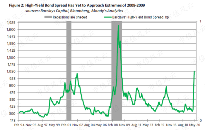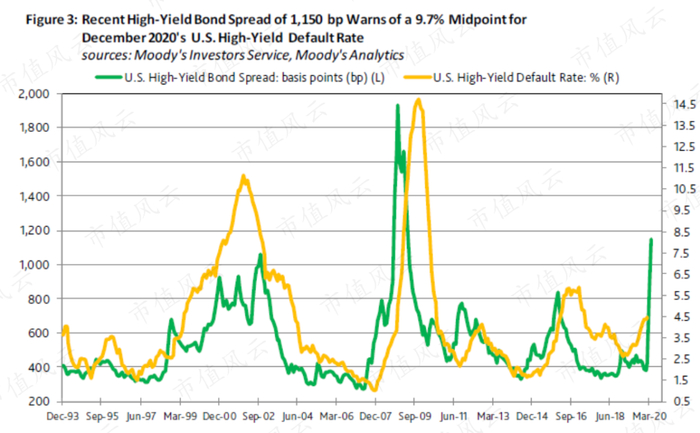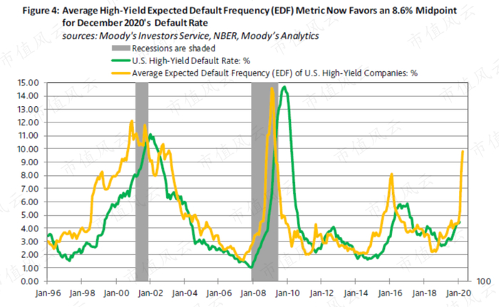 综合高收益债券息差目前预示着美国高收益债券违约率将从2020年2月的4.5%攀升至2020年12月的9.7%。