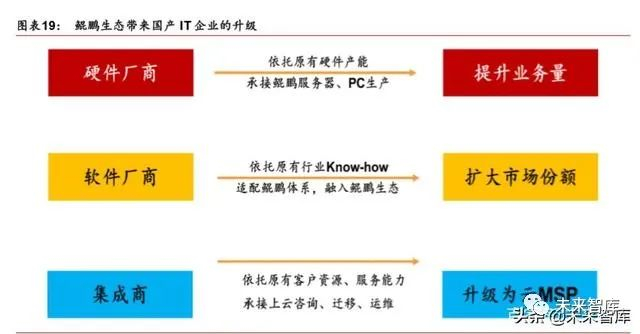 打造鲲鹏生态有望带来国产 IT 行业的升级:对于硬件厂商,依托原有硬件产能,基于鲲 鹏芯片和主板生产整机,未来可提升其业务量;对于软件厂商,依托原有行业 Know-how, 适配鲲鹏体系,融入鲲鹏生态,未来可扩大其市场份额;对于集成商,依托原有客户资源、 服务能力,承接上云咨询、迁移、运维,未来有望升级为云 MSP。